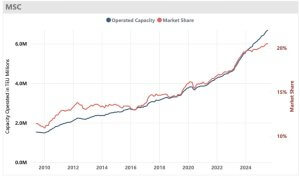 کشتیهای جدید، که به احتمال زیاد از کشتیسازان چینی تأمین خواهند شد، تا سال ۲۰۲۹ بهتدریج به ناوگان MSC ملحق میشوند. این شرکت که مقر اصلی آن در ژنو قرار دارد، در ماههای آینده به اولین خط کشتیرانی جهان تبدیل خواهد شد که ظرفیت ناوگان آن از مرز هفت میلیون TEU عبور میکند.